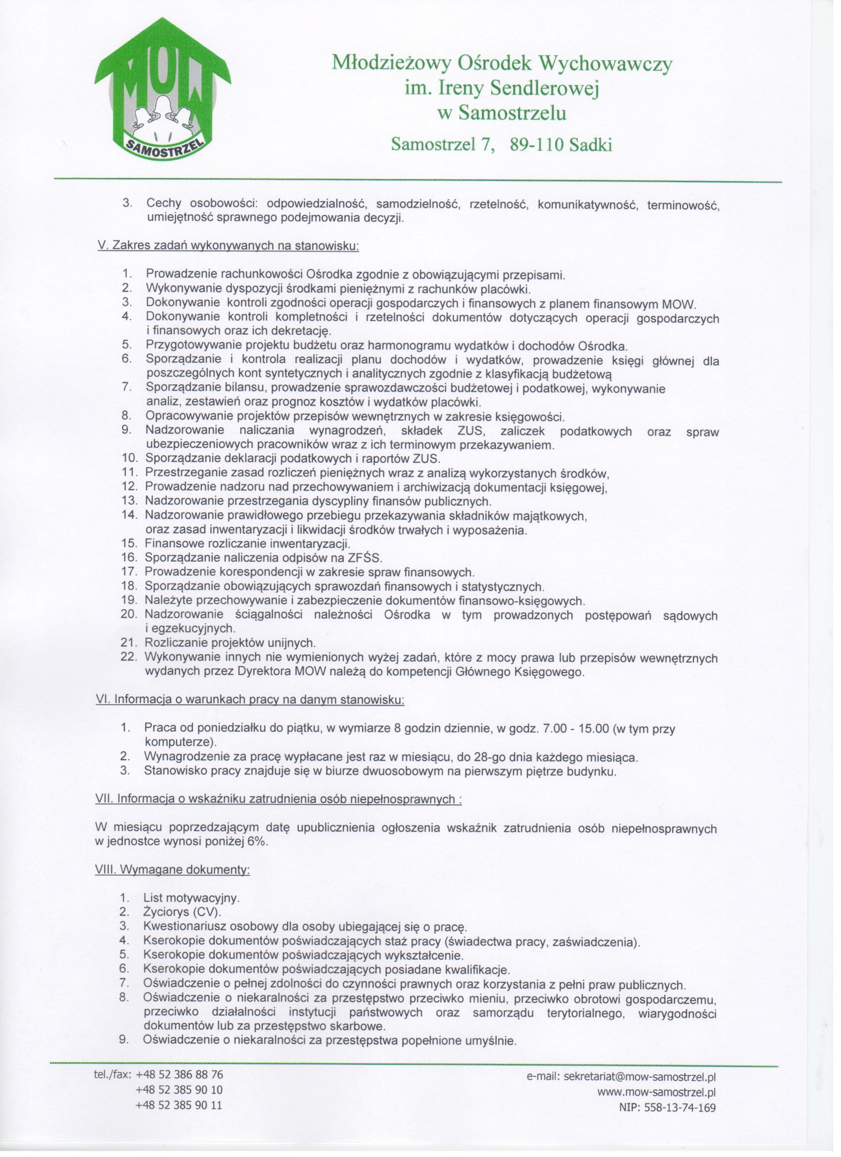 - Sposób składania dokumentówWymagane dokumenty aplikacyjne należy składać w zaklejonej kopercie w sekretariacie Młodzieżowego Ośrodka Wychowawczego im. Ireny Sendlerowej w Samostrzelu, Samostrzel 7, 89-110 Sadki (I piętro) lub za pośrednictwem poczty w terminie do dnia 20.10.2017 r. do godz. 14.00 z dopiskiem "Konkurs na stanowisko głównego księgowego". Dokumenty złożone po wyżej określonym terminie nie będą rozpatrywane.