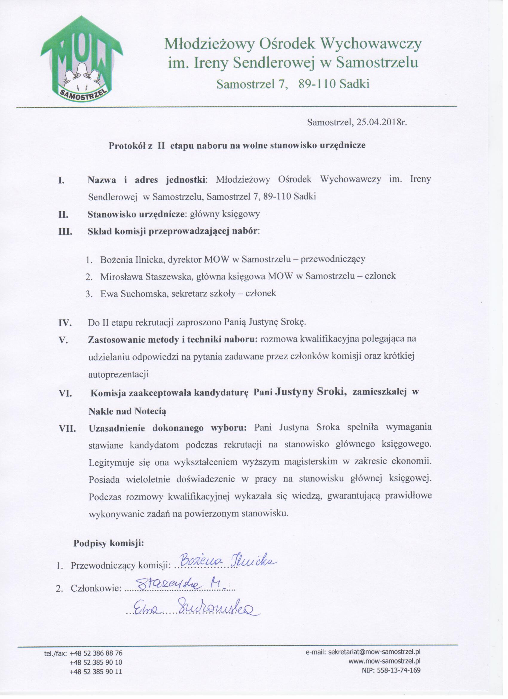 - Sposób składania dokumentówWymagane dokumenty aplikacyjne należy składać w zaklejonej kopercie w sekretariacie Młodzieżowego Ośrodka Wychowawczego im. Ireny Sendlerowej w Samostrzelu, Samostrzel 7, 89-110 Sadki (I piętro) lub za pośrednictwem poczty w terminie do dnia 16 kwietnia 2018 r. do godz. 14.00 z dopiskiem "Konkurs na stanowisko głównego księgowego". Dokumenty złożone po wyżej określonym terminie nie będą rozpatrywane.