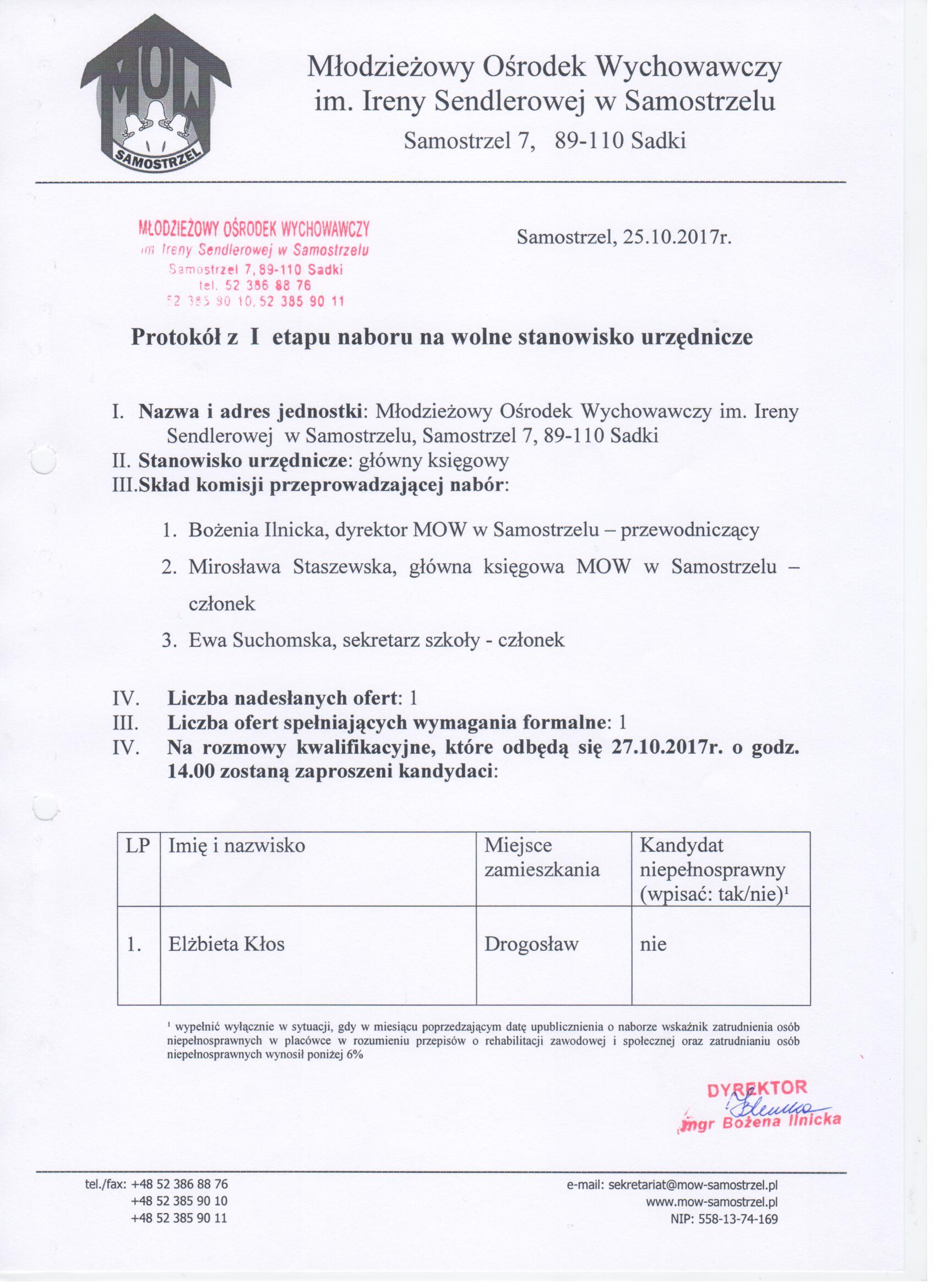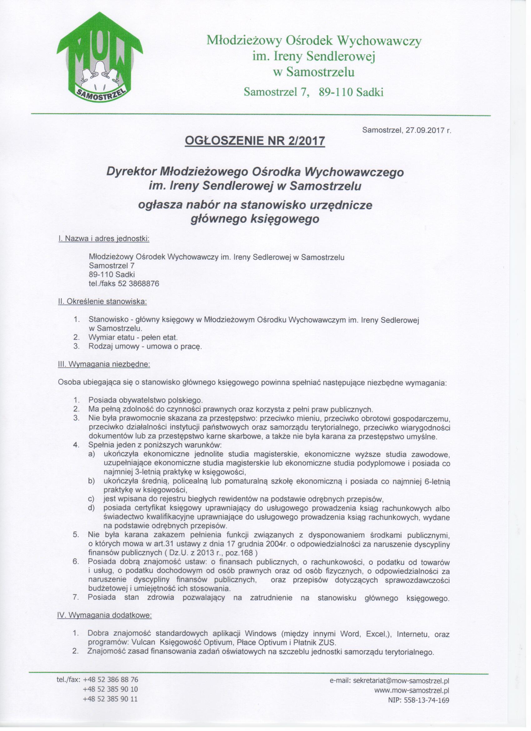 - Sposób składania dokumentówWymagane dokumenty aplikacyjne należy składać w zaklejonej kopercie w sekretariacie Młodzieżowego Ośrodka Wychowawczego im. Ireny Sendlerowej w Samostrzelu, Samostrzel 7, 89-110 Sadki (I piętro) lub za pośrednictwem poczty w terminie do dnia 20.10.2017 r. do godz. 14.00 z dopiskiem "Konkurs na stanowisko głównego księgowego". Dokumenty złożone po wyżej określonym terminie nie będą rozpatrywane.