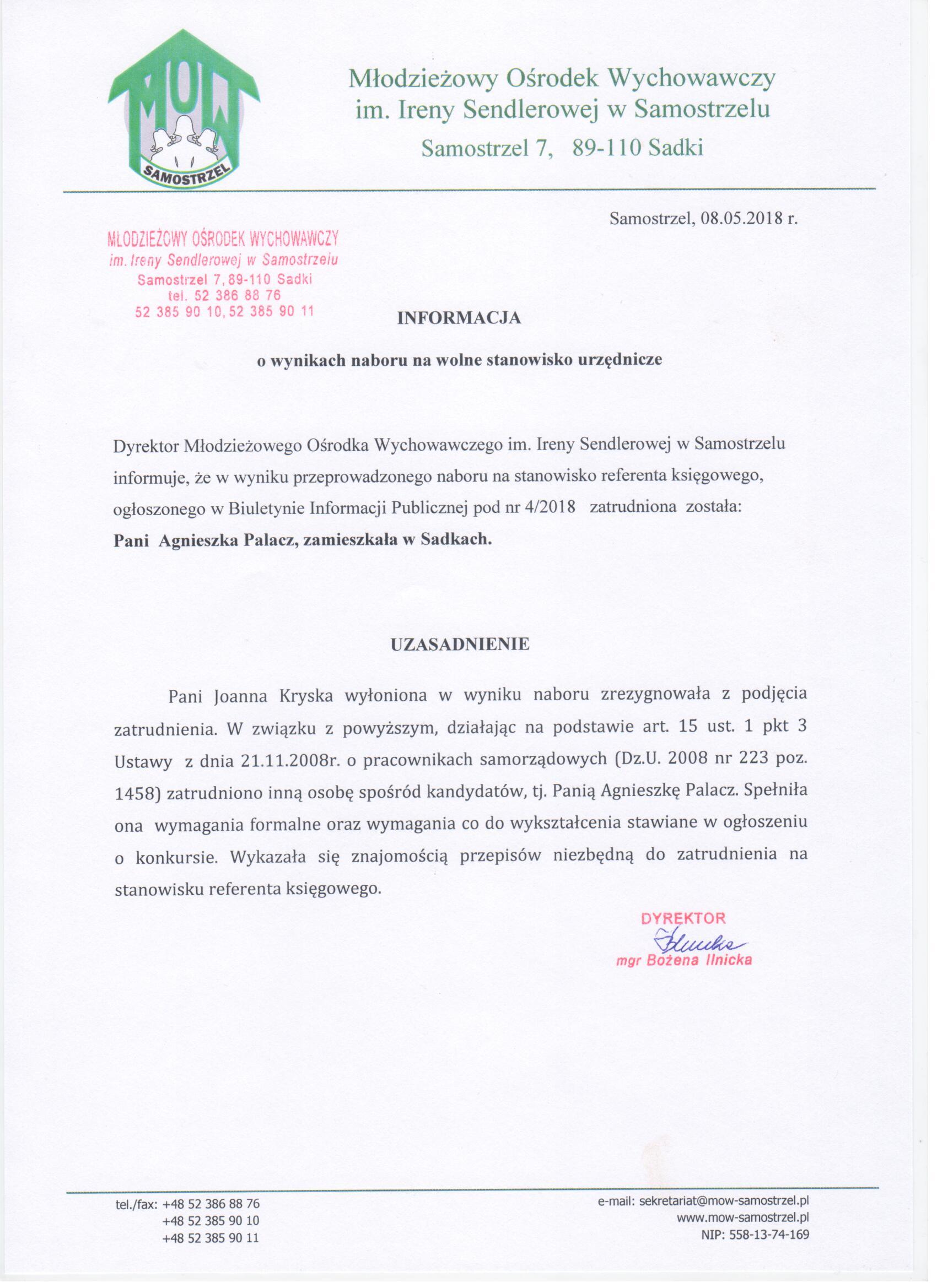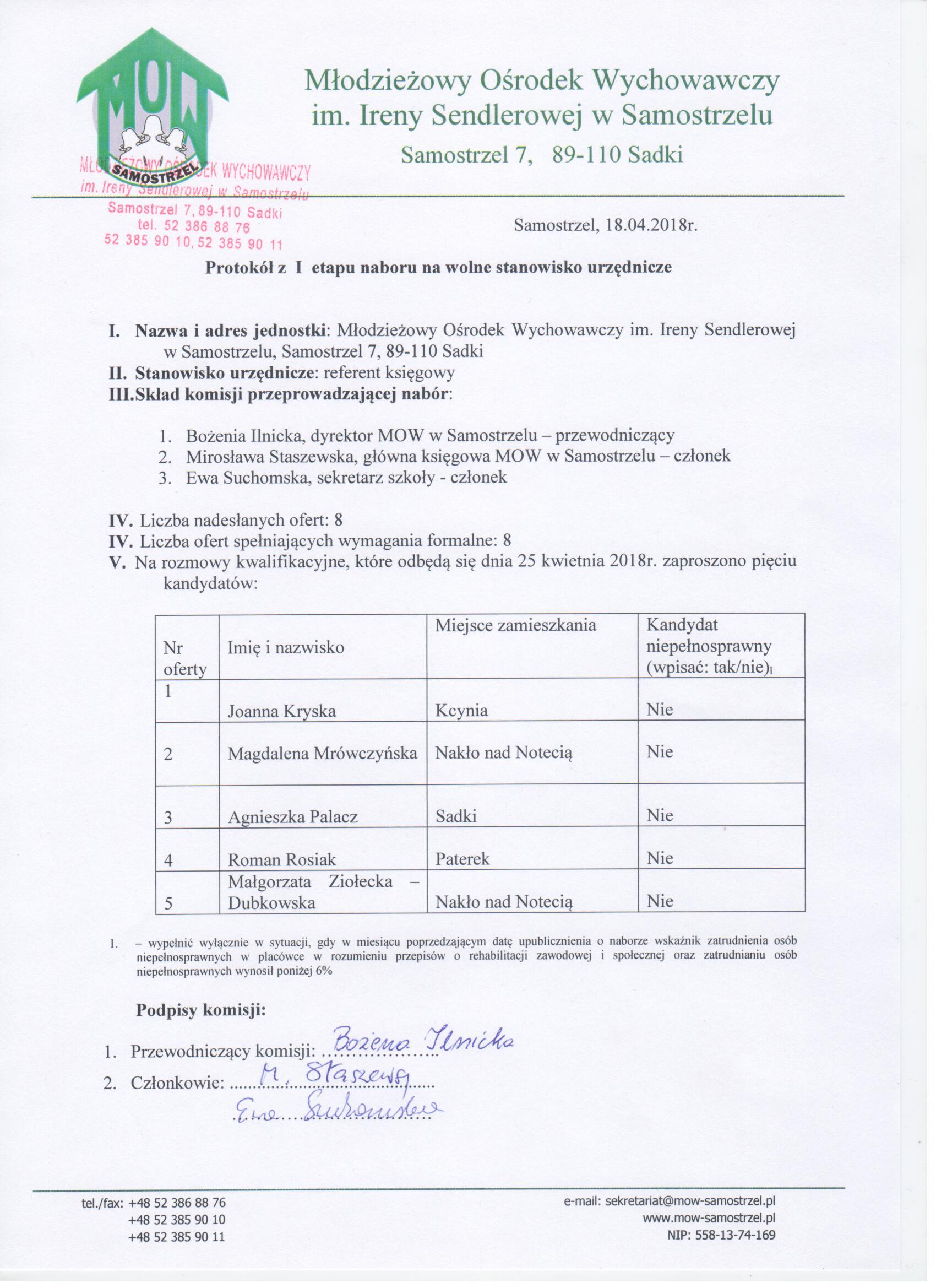 - Sposób składania dokumentówWymagane dokumenty aplikacyjne należy składać w zaklejonej kopercie w sekretariacie Młodzieżowego Ośrodka Wychowawczego im. Ireny Sendlerowej w Samostrzelu, Samostrzel 7, 89-110 Sadki (I piętro) lub za pośrednictwem poczty w terminie do dnia 16 kwietnia 2018 r. do godz. 14.00 z dopiskiem "Konkurs na stanowisko referenta księgowego". Dokumenty złożone po wyżej określonym terminie nie będą rozpatrywane.