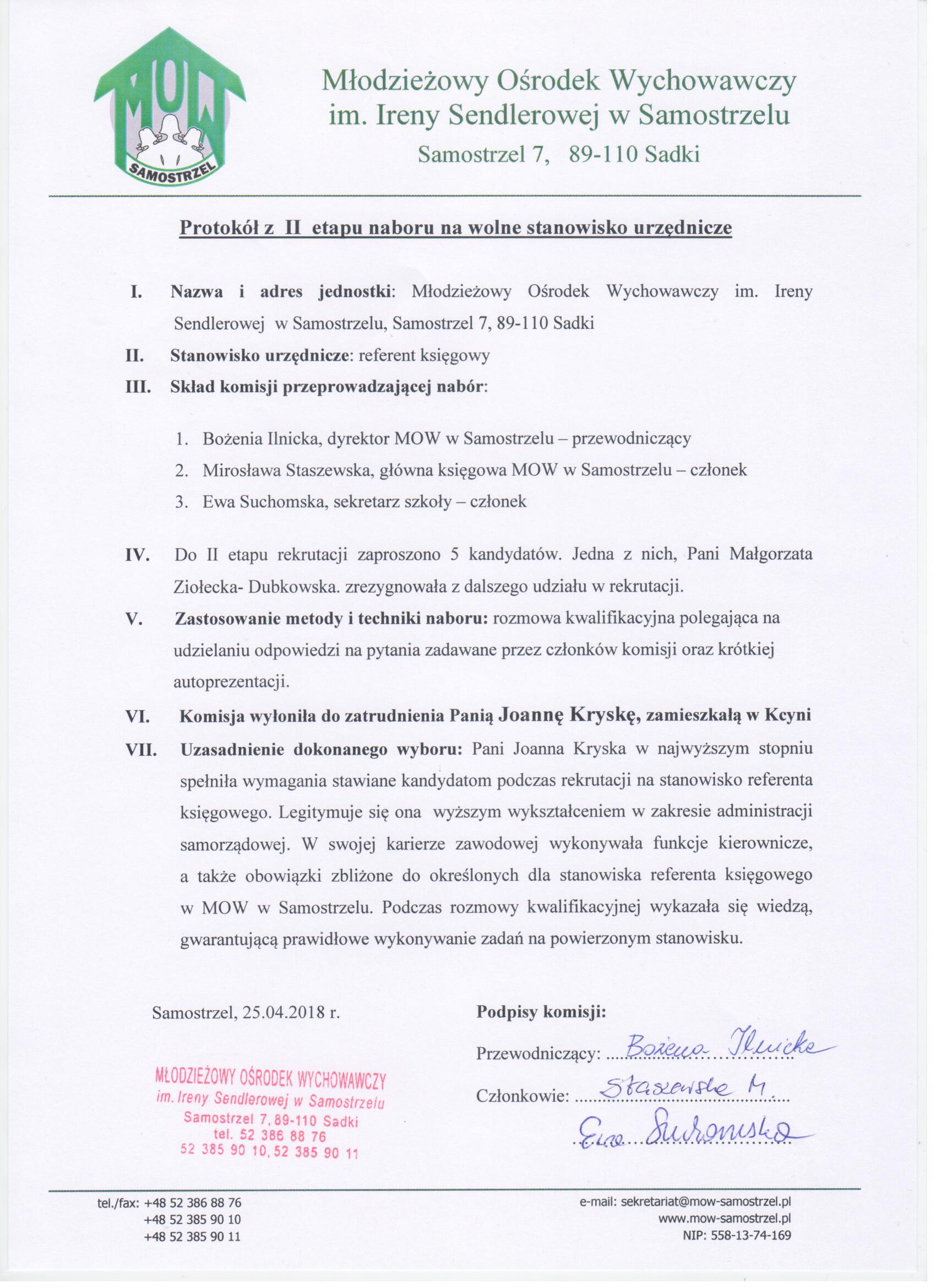 | protokół II etapu naboru na referenta | dodany: 13:48, 27.04.2018 | przez: Bożena Ilnicka | |